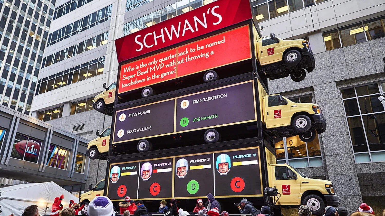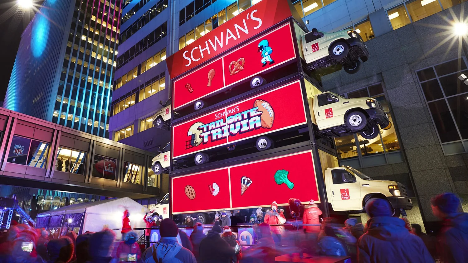 Created a massive interactive trivia experience that brought the brand to life: World's biggest trivia game housed inside Schwan's iconic yellow delivery trucks
